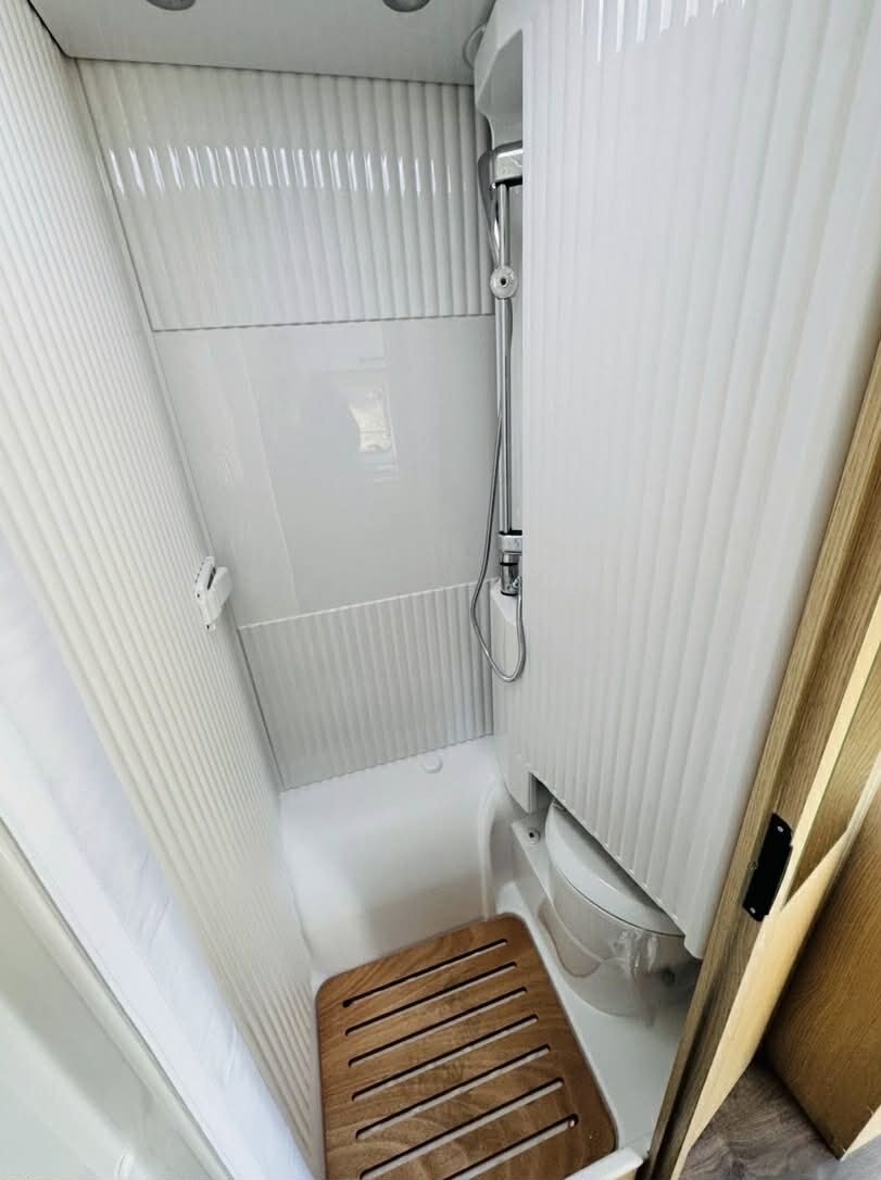 A Garage for storage and rear mounted bike rack. Captains swivel seats and lots of storage.